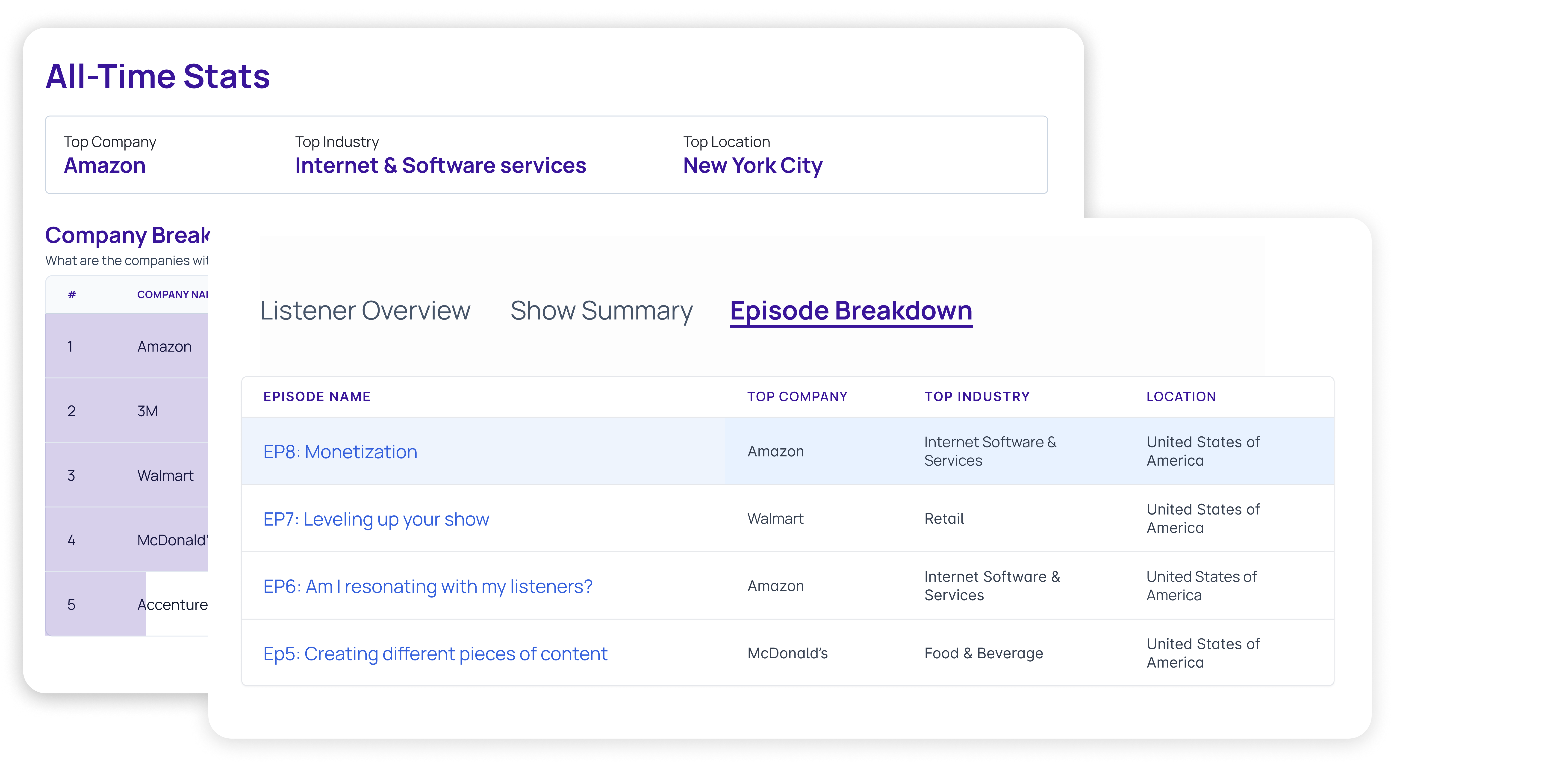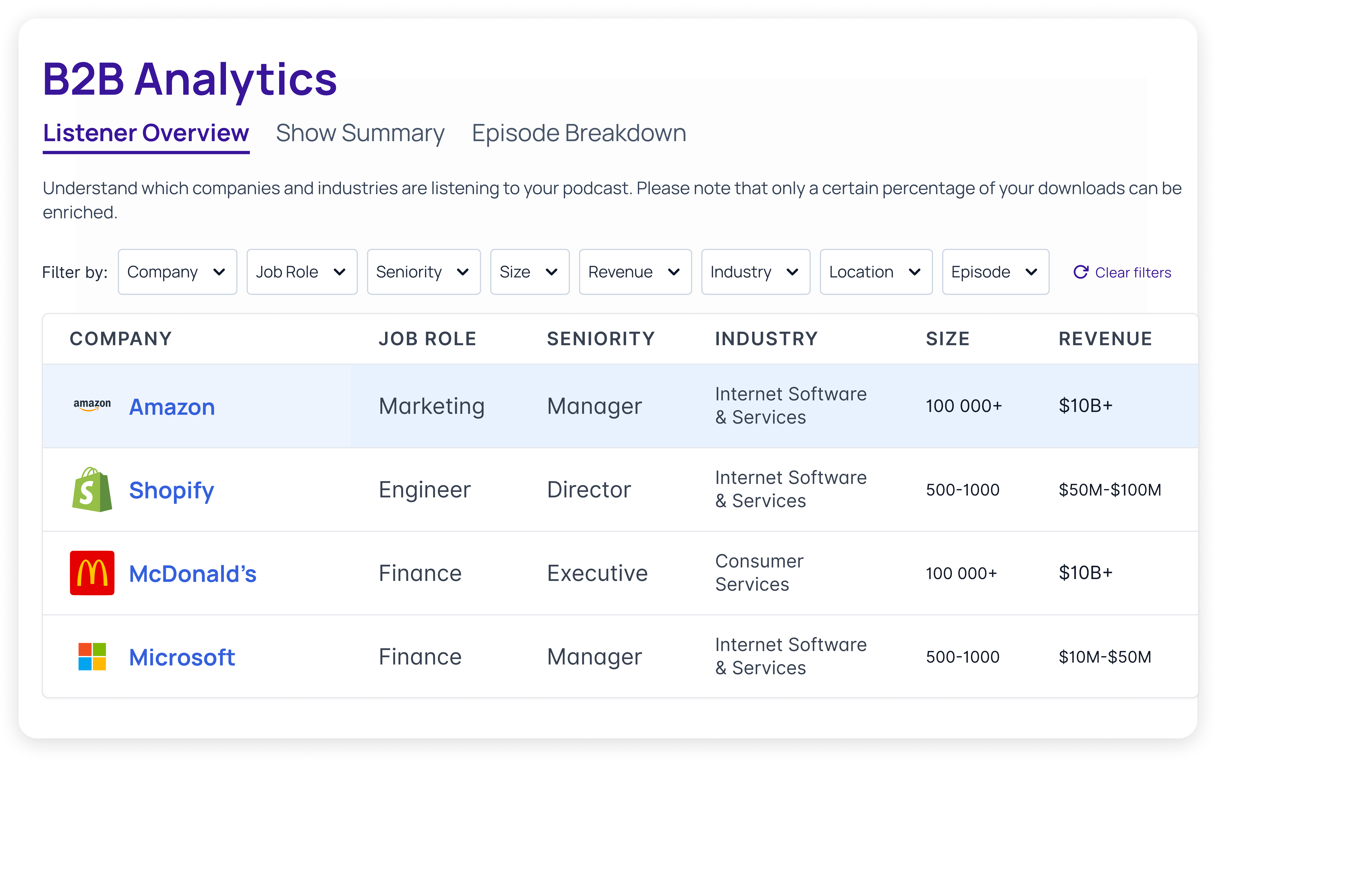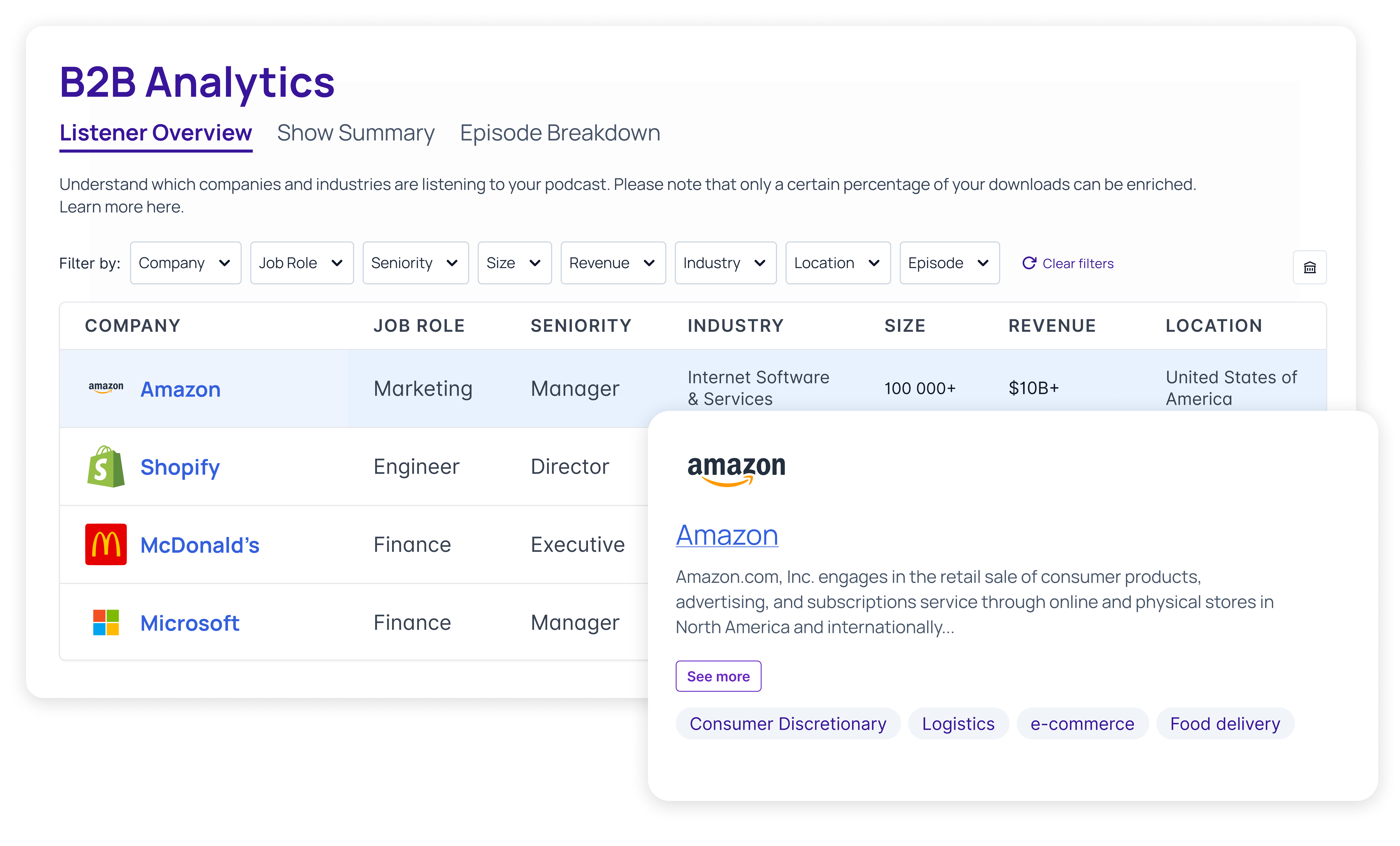 Get a detailed look at the companies listening to each episode, including company size, industry, revenue, and location.