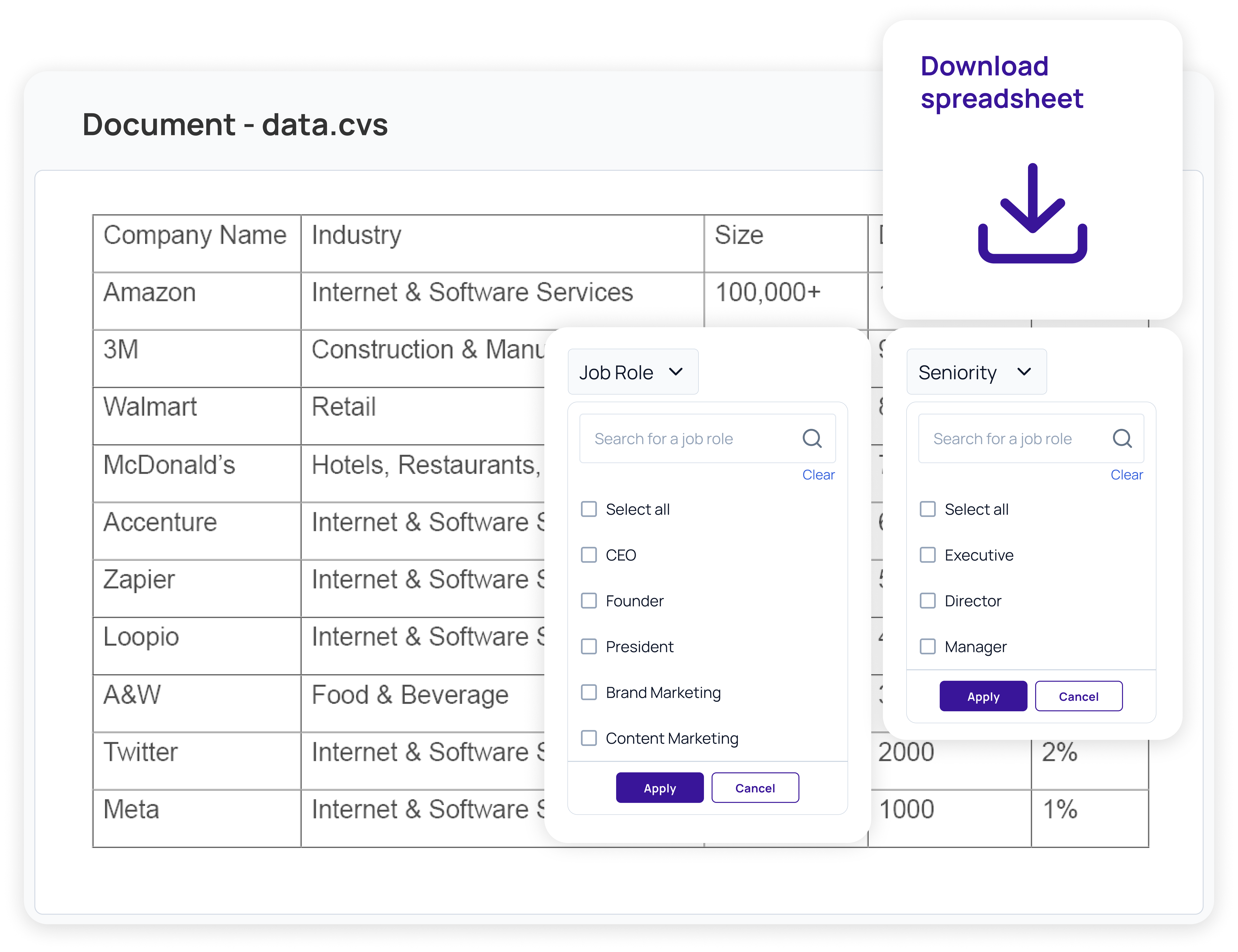 Filter by company, role, seniority, industry, and more, then export lists for ABM and sales