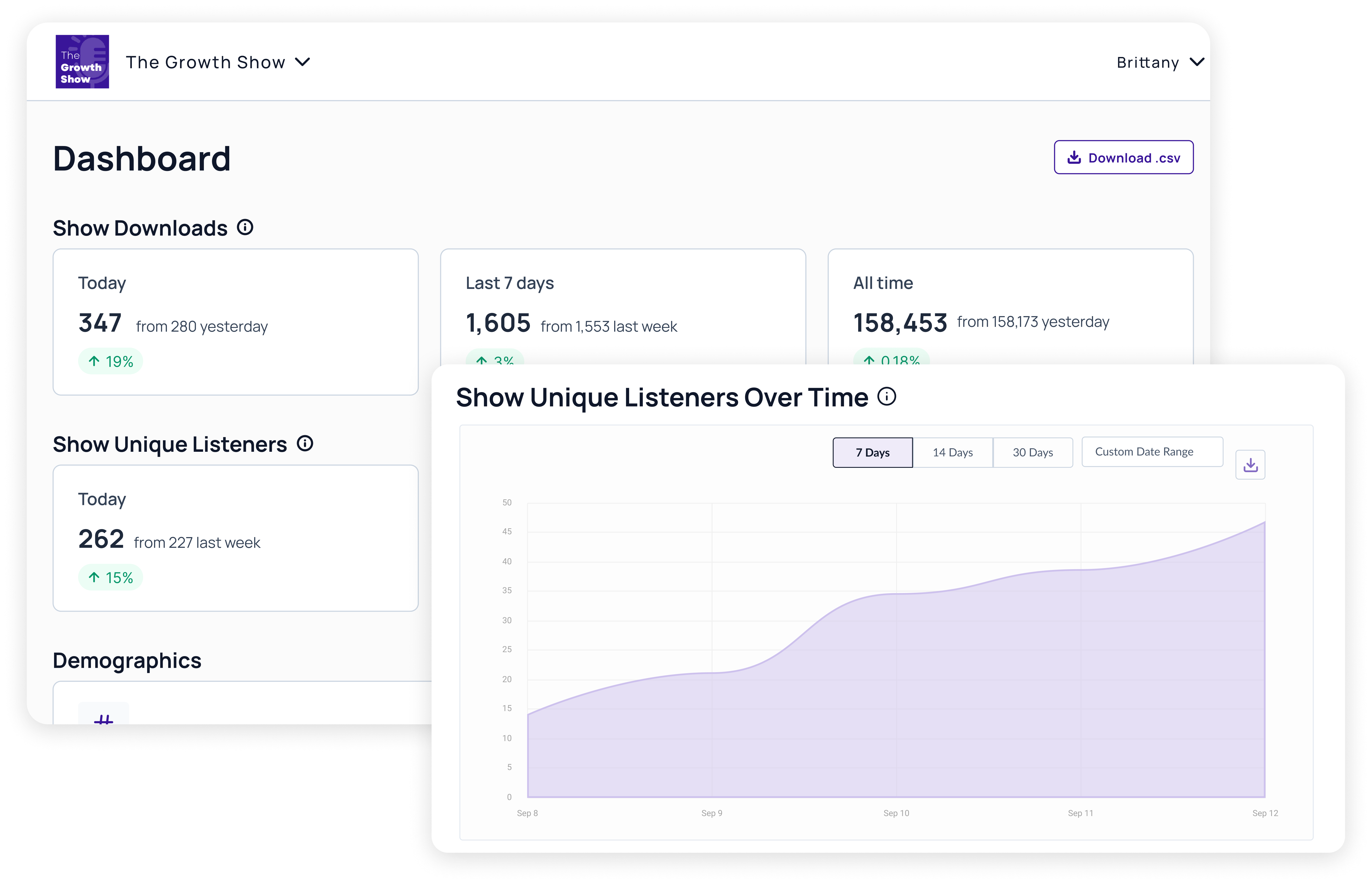 Get an accurate snapshot of your listener data with dedicated downloads and unique listener dashboards
