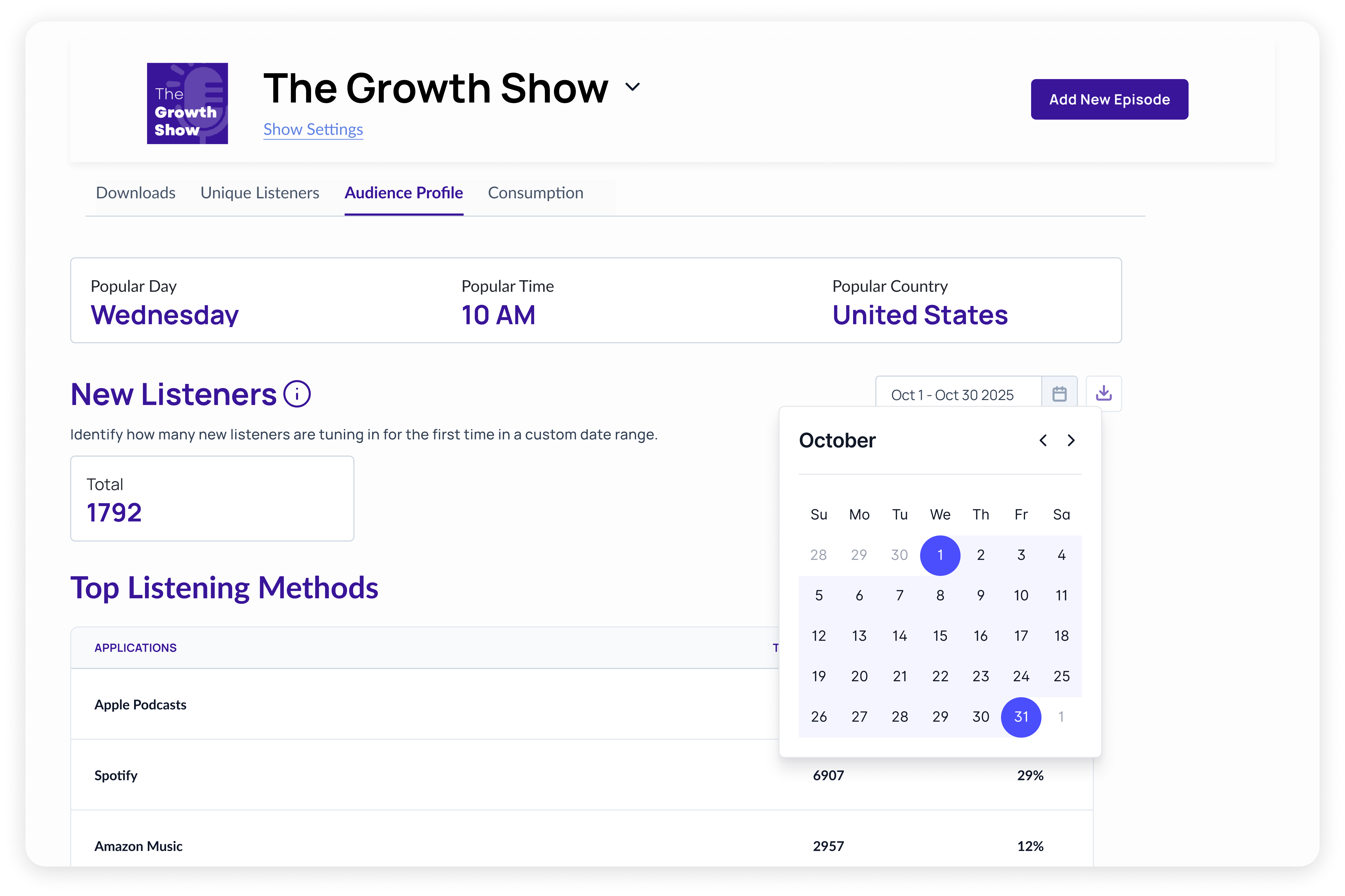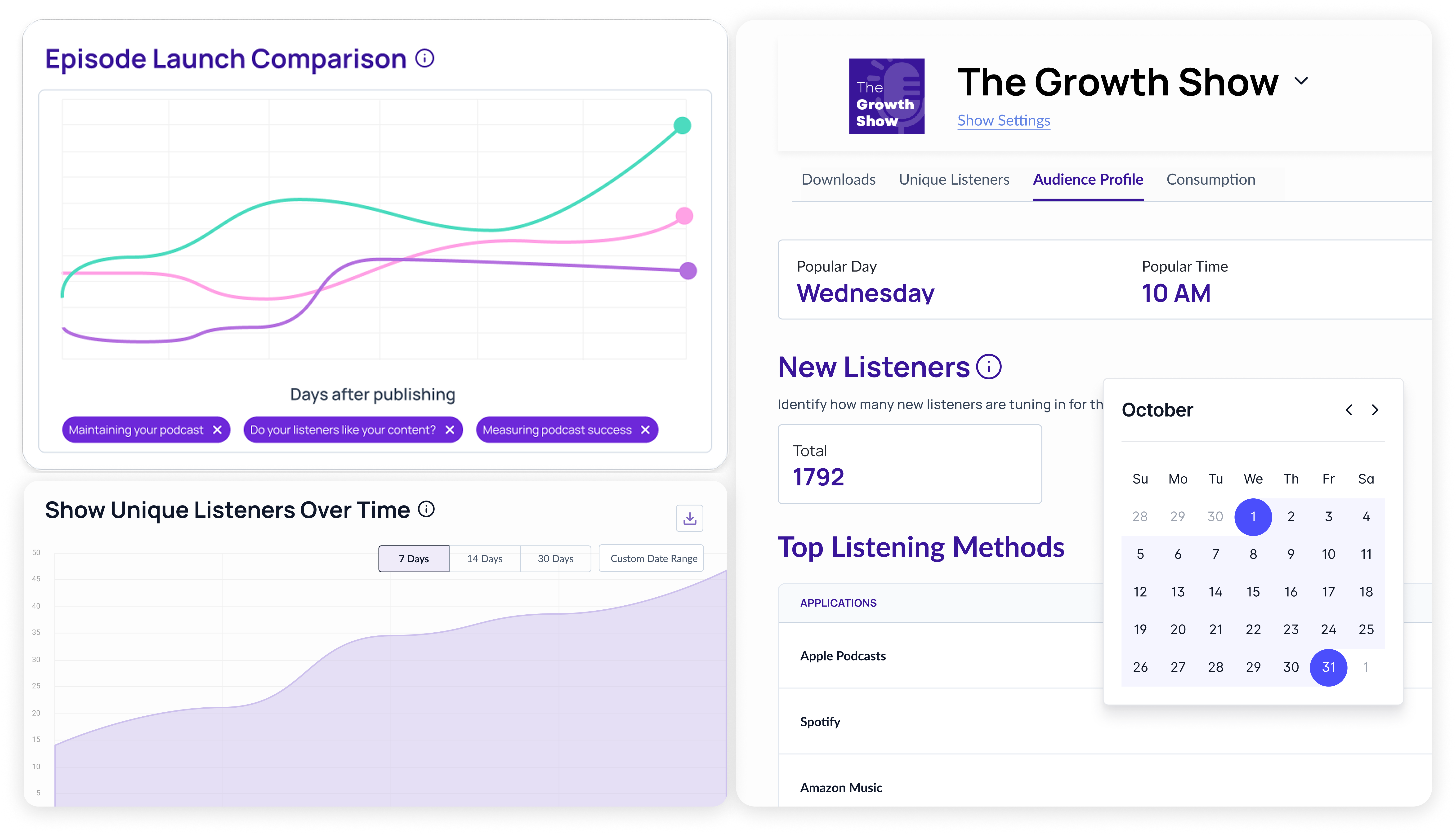 Use Unique Listeners and New Listener Metric to understand reach beyond downloads and report accurate growth.