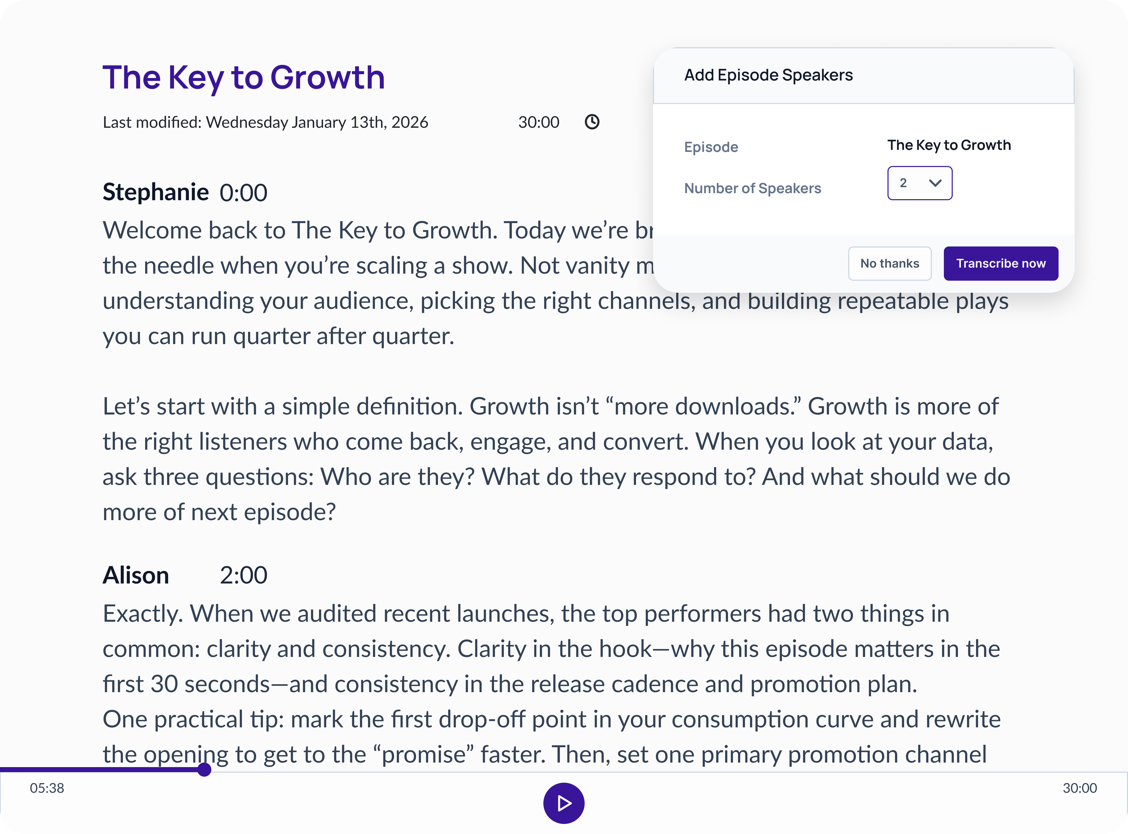 Publish transcripts to capture search traffic and long-tail keywords tied to your episodes and topics.
